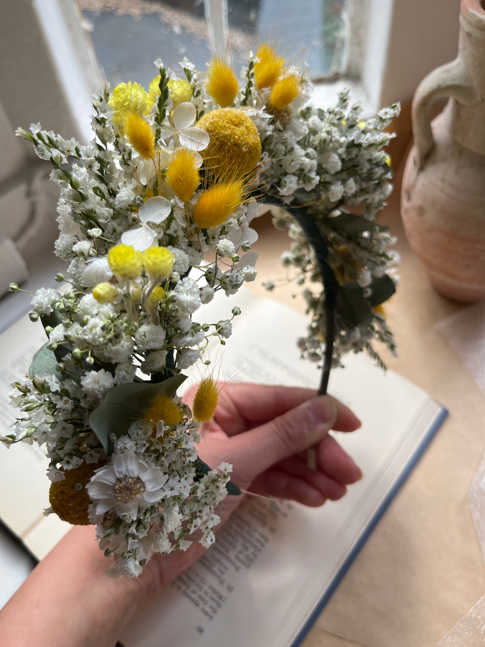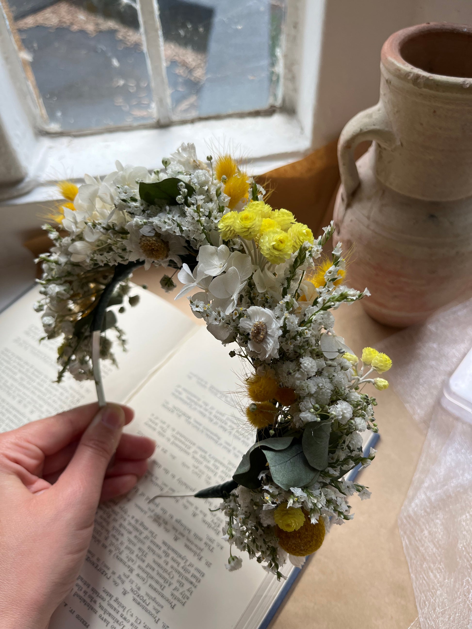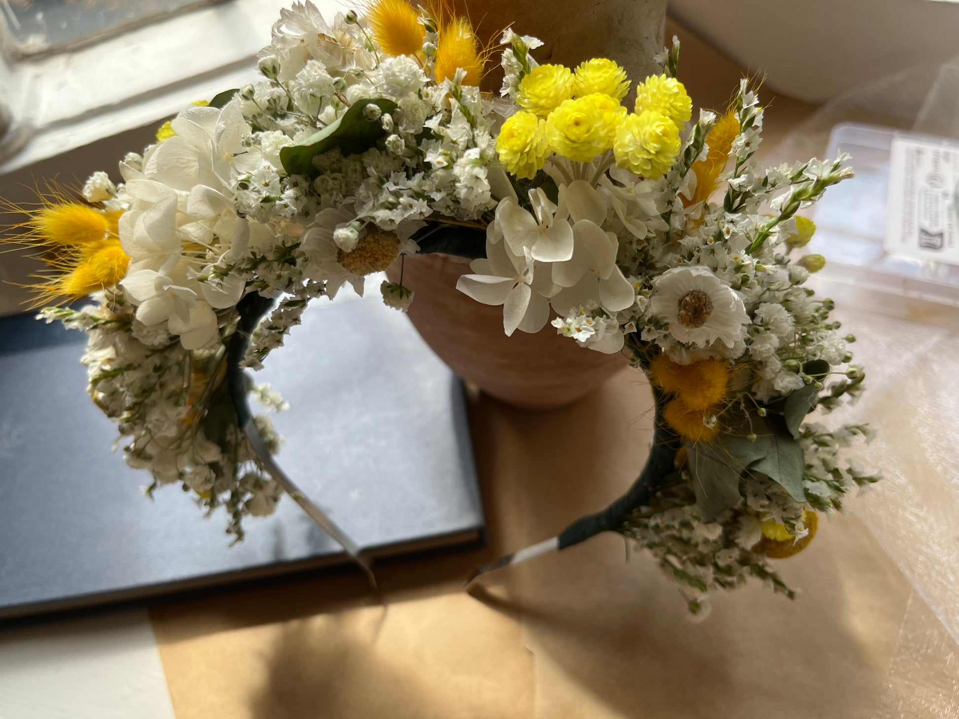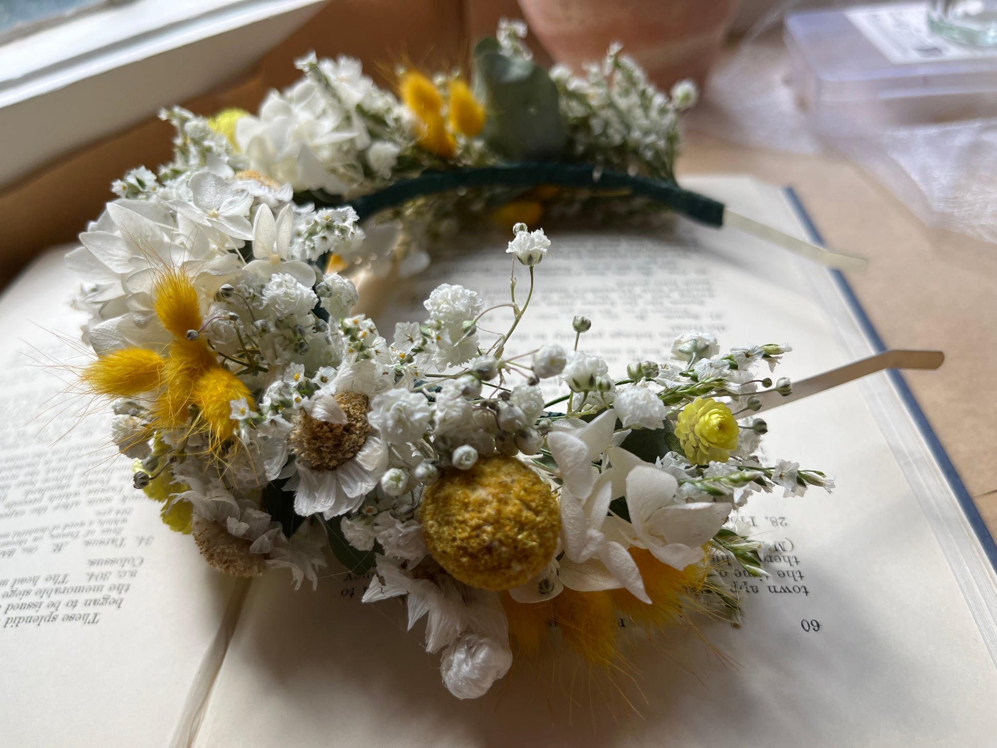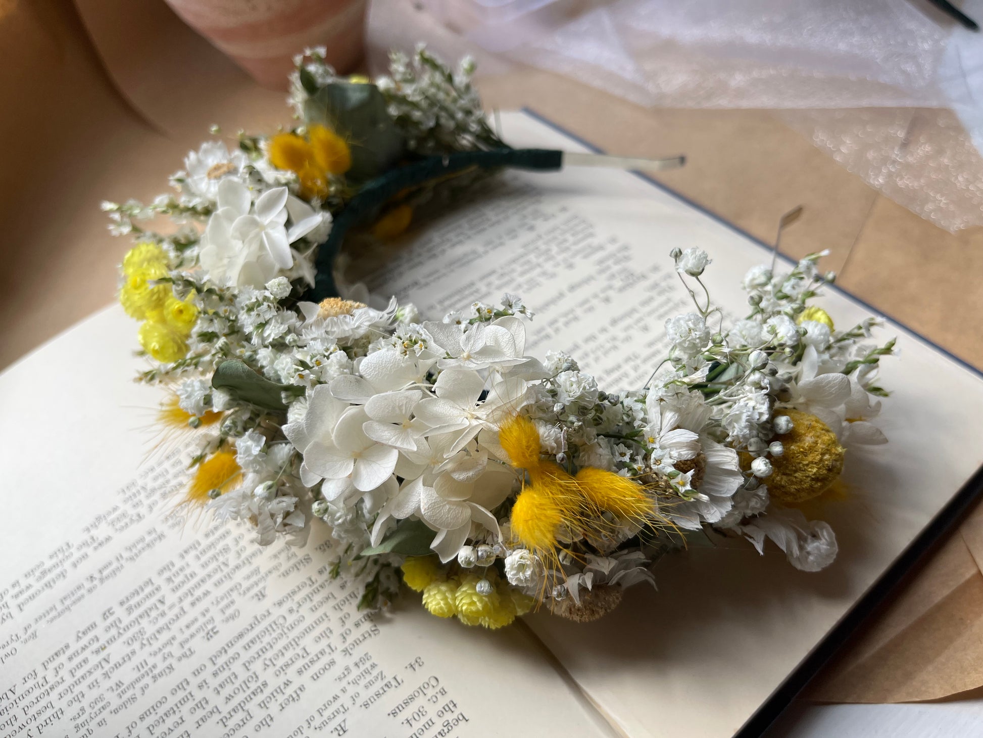 here is a natural and chic-looking flower crown made of real dried flowers. Dried Flower Alice Band For Bride Bridesmaid Flowergirl Hair Wreath // For Wedding Baptism Birthday Party Babyshower Hairpiece.